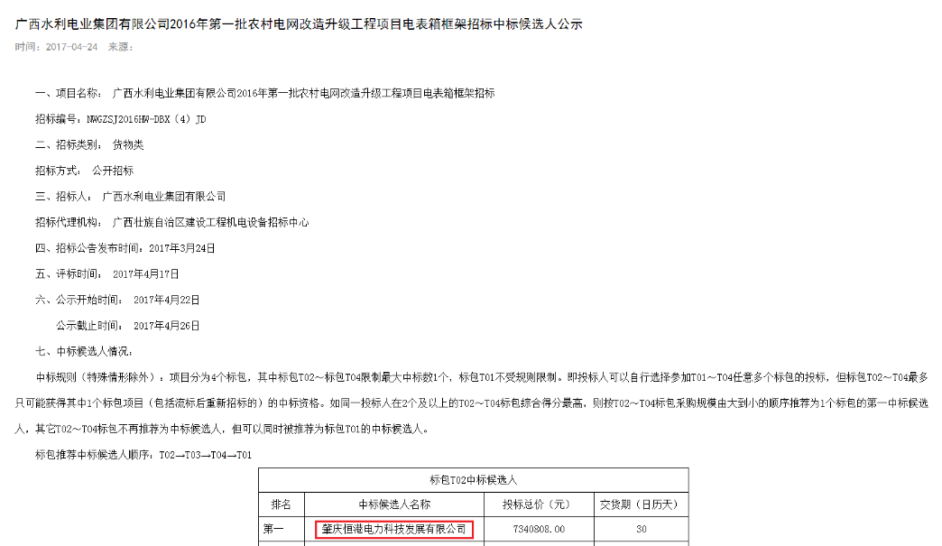 廣西水利電業集團有限公司2016年第一批農村電網改造升級工程項目電表箱框架招標中標候選人公示