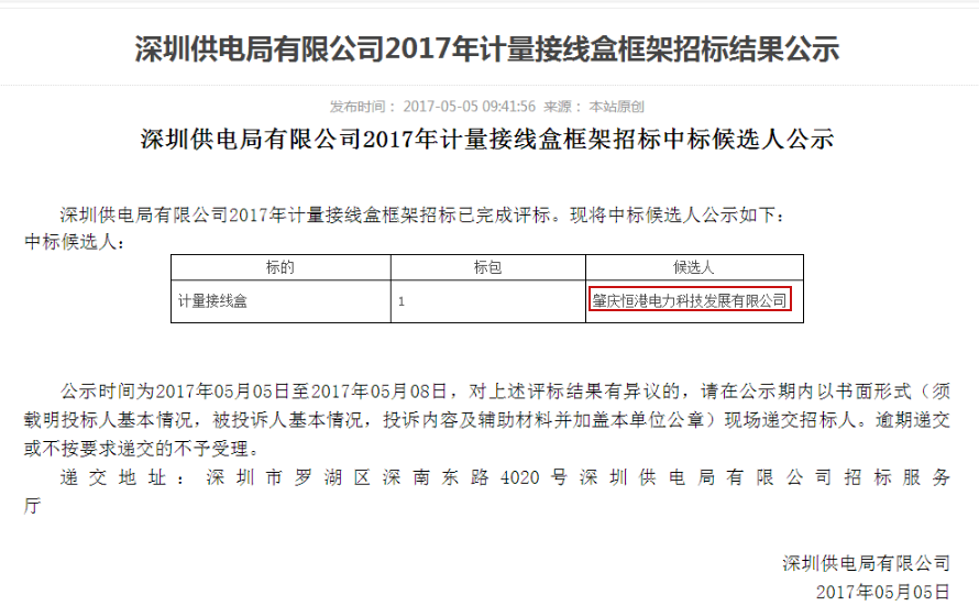 深圳供電局有限公司2017年計量接線盒框架招標結果公示