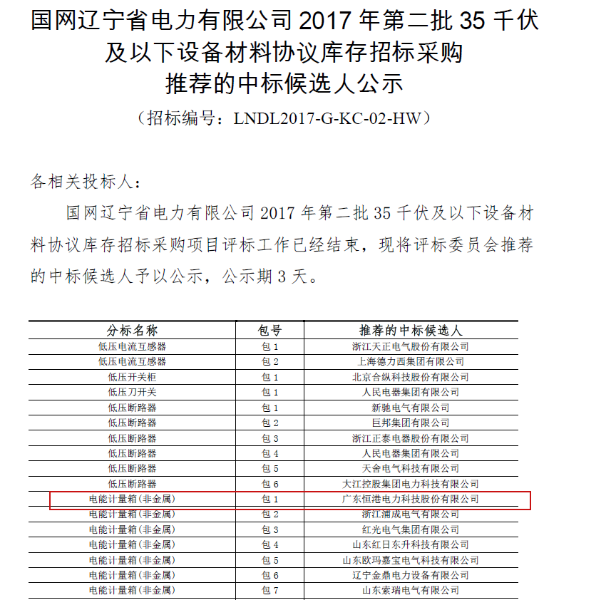 國(guó)網(wǎng)遼寧省電力有限公司2017年第二批35千伏及以下設(shè)備材料協(xié)議庫存招標(biāo)采購中標(biāo)候選人公示