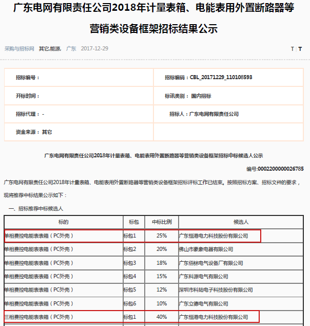 廣東電網有限責任公司2018年計量表箱、電能表用外置斷路器等營銷類設備框架招標(0002200000026785)招標結果公示