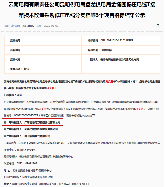 云南電網有限責任公司昆明供電局盤龍供電局金博園低壓電纜T接箱技術改造采購低壓電纜分支箱等3個項目招標結果公示