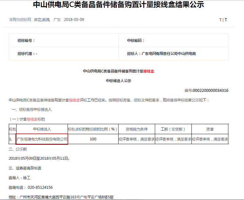 接著來個中山供電局C類備品備件儲備購置計量接線盒的中標信息分享給大家!選擇恒港產品!準沒錯!請認準恒港的商標哦!