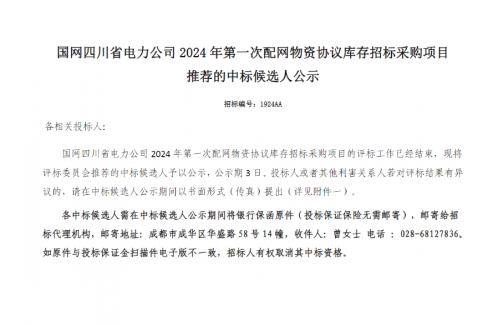 【中標(biāo)喜訊】熱烈祝賀我司中標(biāo)國(guó)網(wǎng)四川省電力公司2024年第一次配網(wǎng)物資協(xié)議庫(kù)存招標(biāo)采購(gòu)項(xiàng)目